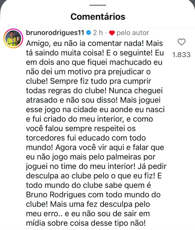 Bruno Rodrigues falou sobre a participação em um torneio durante as férias, em que atuou sem ter autorização do Palmeiras. O clube deve punir o atleta pela conduta.