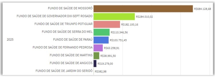 Dados extraídos do Tribunal de Contas do Estado do Rio Grande do Norte (TCE-RN) mostram que os valores pagos pelo município à Dismed, entre 2021 e 2025, somam R$ 13,6 milhões. O pico dos envios ocorreu em 2024, quando os repasses chegaram a quase R$ 6 milhões. A investigação também classifica Mossoró como o Município que mais enviou recursos à Drogaria Mais Saúde em 2025, ao destinar R$ 684,1 mil. Com isso, o volume de recursos movimentados entre 2021 e 2025 com as duas empresas alcança a cifra de R$ 14,2 milhões.