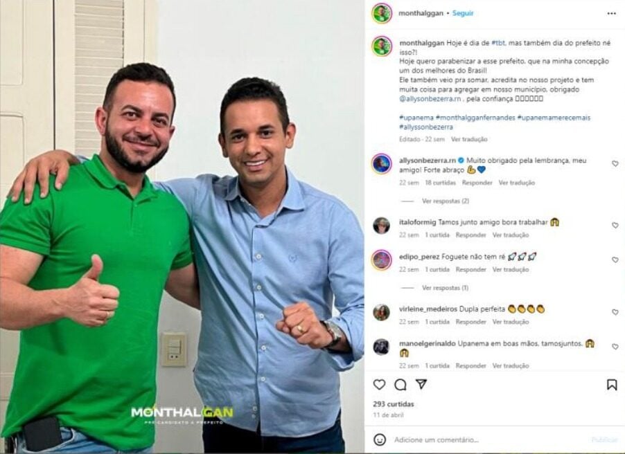 Nesse trecho, a investigação apresenta um print da rede social de Oseas Monthalggan, onde ele publicou uma foto ao lado de Allyson com a legenda: “Hoje quero parabenizar a esse prefeito, que na minha concepção um dos melhores do Brasil! Ele também veio pra somar, acredita no nosso projeto”. Allyson responde: “Muito obrigado pela lembrança, meu amigo!”. Monthalggan foi candidato a prefeito em Upanema pelo MDB e recebeu 3.181 votos. Ele foi derrotado por Renan Mendonça Fernandes (PP).